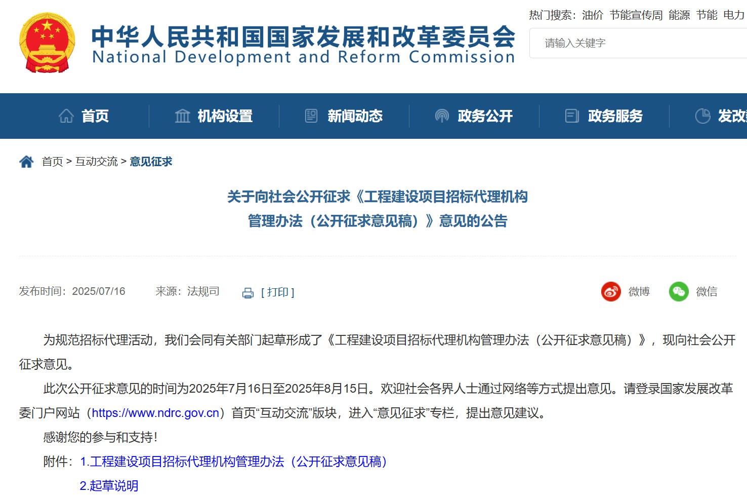 為規范招標代理活動,國家發展和改革委員會會同有關部門起草形成了《工程建設項目招標代理機構管理辦法(公開征求意見稿)》,現向社會公開征求意見。此次公開征求意見的時間為2025年7月16日至2025年8月15日。